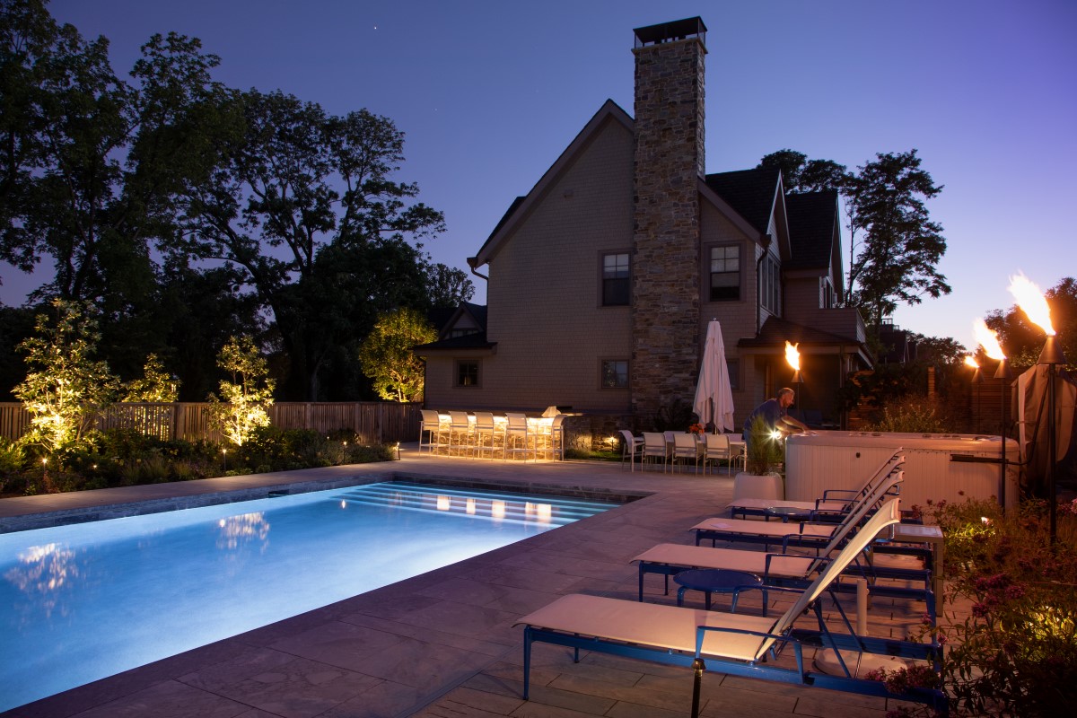A landscape crafted for the newly constructed contemporary home provides the setting for a stylish open-air lifestyle.