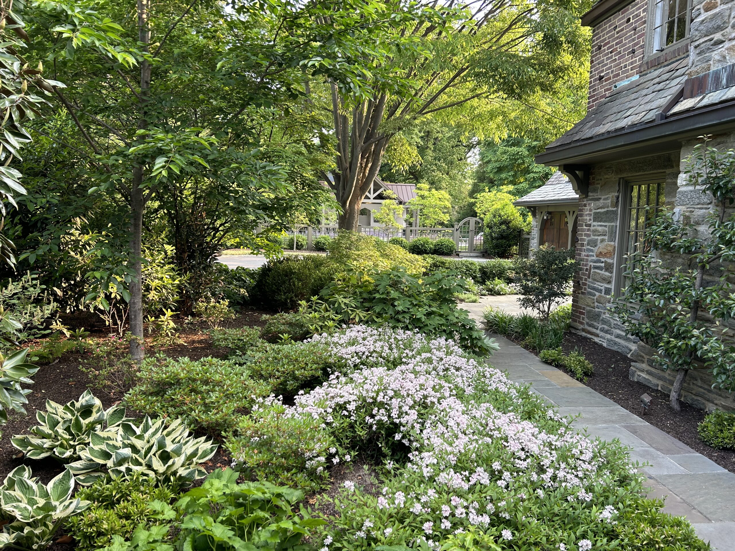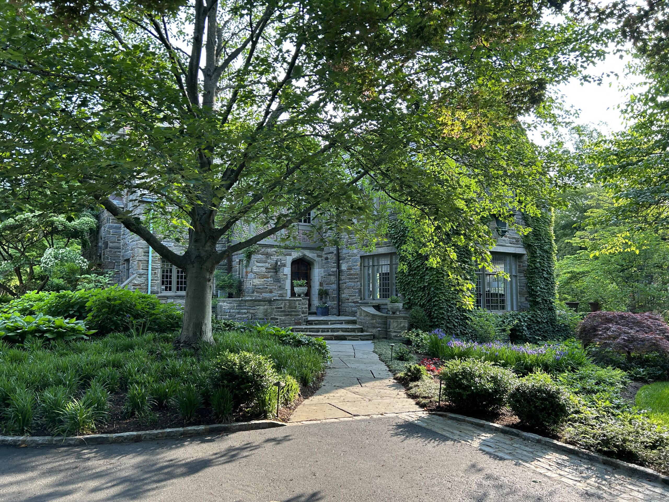 This residence in Swarthmore, Pennsylvania, beautifully integrates traditional Tudor architecture with modern landscaping design to create a space that is both timeless and functional. The design of the new pool house, with its kitchen and bar, adds an elegant touch to the property while complementing the home’s classic architectural style. The carefully designed Belgian block paving on the driveway serves as a graceful transition from the street to the home, while also providing a sense of sophistication to the property. The thoughtful landscaping design around the house enhances the setting, blending the natural beauty of the area with the home’s architecture.